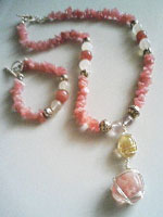 とにかくテーマは”バラ色”なので、バラ色ビーズ(笑)を使っています。インカローズという石が中心のこのアクセサリー。インカローズのさざれ(細かくなったビーズです)の間にムーンストーンとインカローズの丸玉やシルバービーズを加えて、ヘッド部分は石をワイヤーでぐるぐる巻いてペンダントヘッドのように付けています。ヘッドにつけているのはビーズ穴が開いていない石なので、ワイヤー等で加工しないとイカンのでね~。