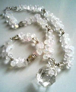 ハーキマーダイヤモンドをワイヤーで巻いて、ドロップカット(涙型)されているローズクォーツとムーンストーンを中心に、間に針水晶と呼ばれるルチルクォーツとシルバービーズを付けたアクセサリーです。