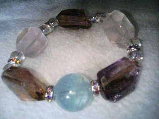 これが試作品、アクアマリンとローズクォーツとアメトリンの大きめビーズに水晶ビーズを合わせたもの。ビーズ数が少ないのでこれは売り物にはしませんが、これを元にして。