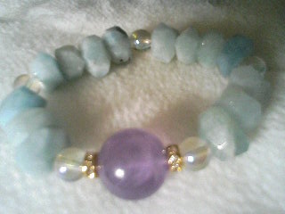 こっちが売り物用、色合いから”七啓ブレス”と命名(笑)。ラベンダーアメジストの大玉とミルキーカラーのアクアマリンの小粒ビーズ。あとは水晶ビーズを合わせたもの。凝ったデザインではないですが全体的にボリュームのあるものが出来ました。