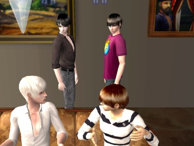 電話がかかってきてシム2七条さんが電話にでるために席をはずしている時の写真。ニューご近所さん、シム2啓太君をガン見(笑)。危険です!ニューご近所さんに狙われています!!