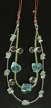 外側は水晶の小ビーズ&アクアマリンのさざれ。中側はペリドットのボタン(ソロバン)型ビーズ&大きめのドロップ型水晶ビーズ&フローライトのラフロックタンブル。
